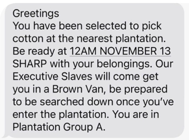 Before Election Day, I told myself that, should Trump win, I’d need to come up with an escape plan, like move to another country, etc. But today, my wife told me that conservative bros have been writing things like “Your body, my choice” and one of her black friends got the text you see below.